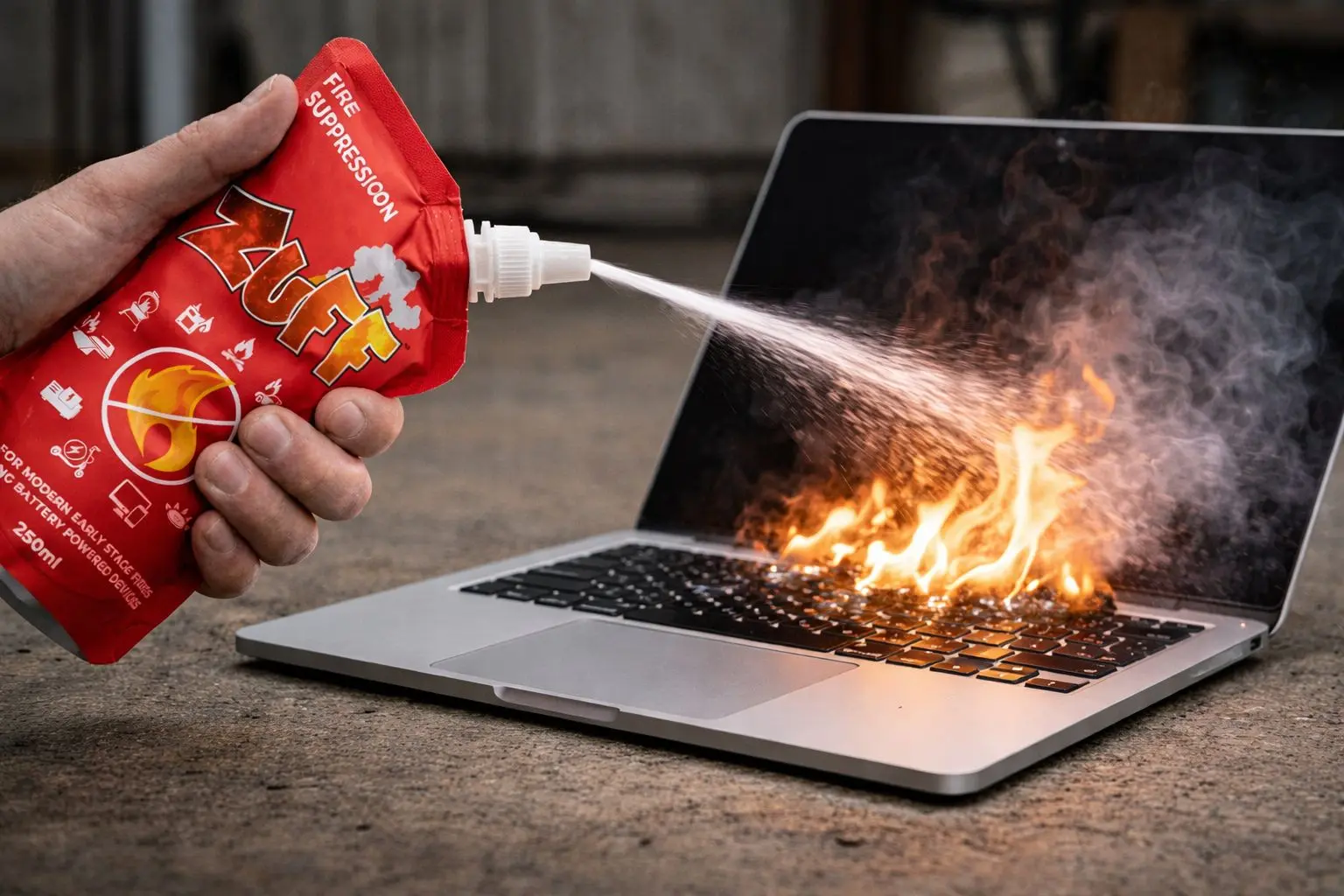 The ZUFF Fire Suppressor is capable of safely handling all fire types including lithium battery fires—making fire safety accessible, fast, and reliable for homes, vehicles, and modern technology.