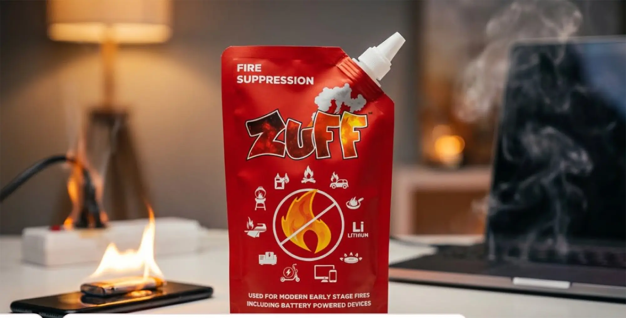 ZUFF Fire Suppression Spray is designed to help consumers respond quickly to small, early-stage fires involving everyday devices and environments, offering a simple, compact fire safety solution for situations where speed and accessibility matter.